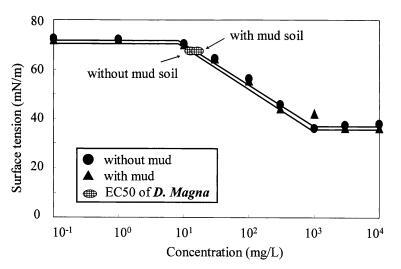 圖11泥質(zhì)土壤存在對LAS表面張力曲線和大型水蚤有毒表面張力值的影響。