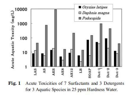 使用3種測試生物:米齊亞屬latipes、大型水蚤(daphnia magna)和podocopida,測定了7種表面活性劑和3種商用洗滌劑的急性毒性。 結(jié)果如圖1所示。 在所有情況下,足爪螨的EC50和/或LC50均高于寬脊稻和大型水蚤。 肥皂和LB對稻瘟病菌的毒力值高于對大型水蚤的毒力值,而其他5種表面活性劑對稻瘟病菌和大型水蚤的毒力值幾乎相等。 表面活性劑可分為3類; 低毒組(AES、SOAP和AE12)、中毒組(LAS和AS)和高毒組(AE8和LB)。