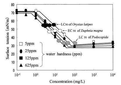 雖然表面張力不是毒性的絕對因素,但表面活性劑的急性水生毒性與表面活性劑的界面活性密切相關(guān)。 已有報道表明:水硬度對幾種表面活性劑的水生毒性的影響,以及無機(jī)鹽對某些表面活性劑溶液表面張力的影響。 然而,還沒有研究將這三個因素聯(lián)系起來。 因此,我們試圖通過改變水的硬度來闡明表面活性劑溶液的表面張力與水生毒性之間的關(guān)系。