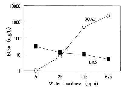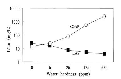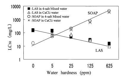 在預(yù)試驗中,大型水蚤在4鹽混合溶液中存活,但在CaCl2?H2O溶液或蒸餾水中不能存活。 另一方面,角鯊在所有3種水中都能存活。 因此,使用podocopida研究了水硬度成分對LAS和肥皂毒性的影響。 如圖3所示,CaCl2?H2O溶液和4-鹽混合溶液的毒性值沒有差異。 肥皂的毒性隨水硬度的增加而降低,LAS的毒性隨水硬度的增加而增加。