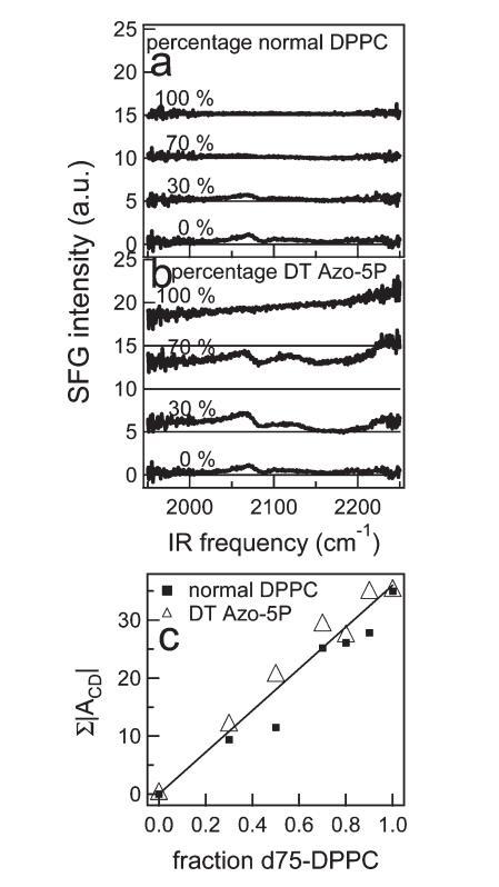 圖9。 (a) 正常DPPC和d75 DPPC不同混合物的CD區(qū)VSFG光譜。 圖中給出了混合物中正常DPPC的百分比。 為清晰起見,光譜偏移,細(xì)線表示零。 (b) 與a部分類似,但適用于DT Azo-5P與d75 DPPC的混合物。 (c) 通過擬合文中描述的VSFG光譜獲得的CD振動(dòng)振幅之和,作為含正常DPPC或DT Azo-5P的二元混合物中分?jǐn)?shù)d75 DPPC的函數(shù)。 在本實(shí)驗(yàn)中,為了獲得混合物的高質(zhì)量數(shù)據(jù),IR通量很高,導(dǎo)致通過VSFG光譜中相對(duì)較高的CH2和CD2振幅觀察到的脂質(zhì)尾部出現(xiàn)小的無(wú)序。