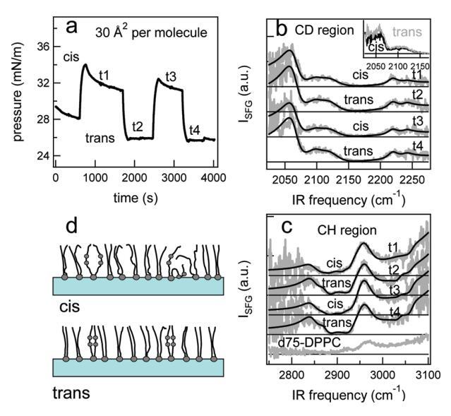 圖7。在脂質(zhì)/H2O界面處,DT Azo-5P/d75 DPPC的1:5混合物的結(jié)果,每個(gè)分子的面積為30?2。(a) 表面壓力與時(shí)間的關(guān)系。用370和450 nm光照射~100秒分別產(chǎn)生順式(高壓)和反式(低壓)狀態(tài)。壓力的微小劇烈波動(dòng)是由于樣品高度的變化,以校正水的蒸發(fā)。順式狀態(tài)下表面壓力的降低可能是由于單層的松弛或膠束或囊泡的形成減少了表面脂質(zhì)的數(shù)量。(b) 相應(yīng)的VSFG光譜(灰色)以及CD區(qū)域的擬合。為了清晰起見,光譜已被抵消。插圖顯示了相互重疊的反式和順式光譜,以強(qiáng)調(diào)差異。(c) VSFG光譜(灰色)以及用于引導(dǎo)眼睛進(jìn)入CH區(qū)域的擬合。底部曲線顯示了在P時(shí)純d75 DPPC的光譜~ 40百萬(wàn)/米。(d) 脂質(zhì)尾部方向的示意圖。光開關(guān)脂質(zhì)的偶氮苯部分用灰色圓圈表示。