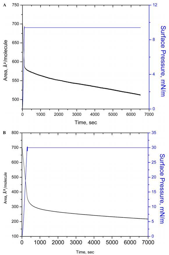 圖3.在亞相pH值5.6下,在表面壓力為10(A)和30 mN/m(B)的條件下,對人胰島素Langmuir單層膜進行90 min的穩定性測量。