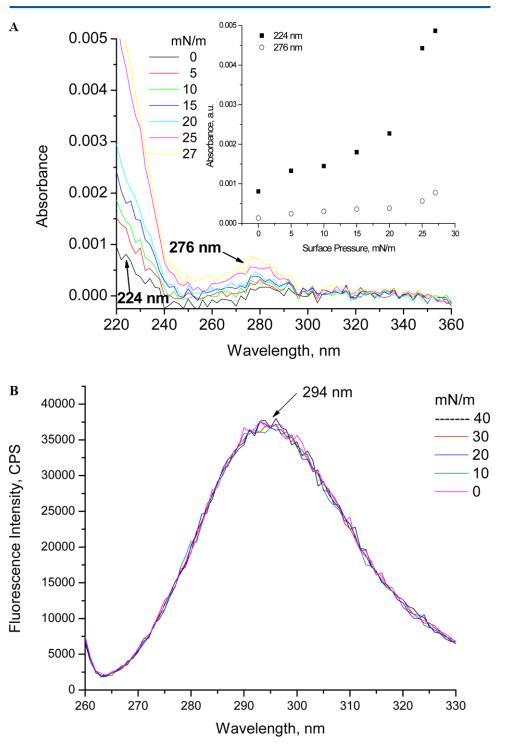 圖5.(A) 紫外線 ? 亞相pH值為5.6時人胰島素Langmuir的可見光譜。 插圖顯示了224和276 nm處吸光度隨表面壓力的變化。 (B) 亞相pH 5.6下人胰島素朗繆爾的熒光光譜(λ激發=270 nm,激發和發射時的狹縫寬度分別為5和5 nm)。