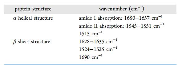 表2。 α螺旋和β片的主帶位置特征及酰胺Ⅰ和酰胺Ⅱ的紅外振動