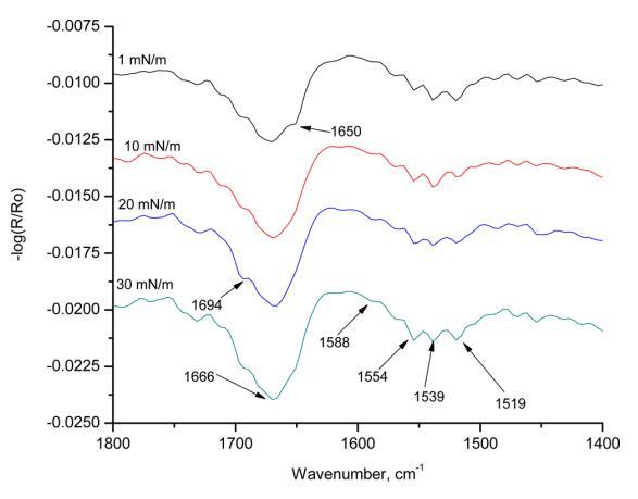 圖9顯示了在不同表面壓力下獲得的HI-Langmuir單層膜的s偏振輻照度。 在1 mN m的表面壓力下 ? 1,在1650 cm處存在一條帶 ? 1對應于α-螺旋。 隨著表面壓力的增加,該條帶消失,并在1666 cm處并入該條帶 ? 1. 這條帶子長1666厘米 ? 1包括β-轉角和α-螺旋。 這條帶子有1694厘米長 ? 1對應于β片。 這條帶子在1519厘米處 ? 1也對應于α-螺旋。 在入射角為60°的情況下,在1670處觀察到的能帶可歸屬于存在于β-轉角中的空間約束C=O部分,或者由于β-薄片中的躍遷偶極耦合而注意到峰值中的分裂。 當改變表面壓力時,最強烈的譜帶出現在1554和1539厘米處 ? 1,兩條帶均對應于酰胺II區的α-螺旋。 所有三條主譜帶都表明HI-Langmuir單層的s極化輻照度中存在α-螺旋。