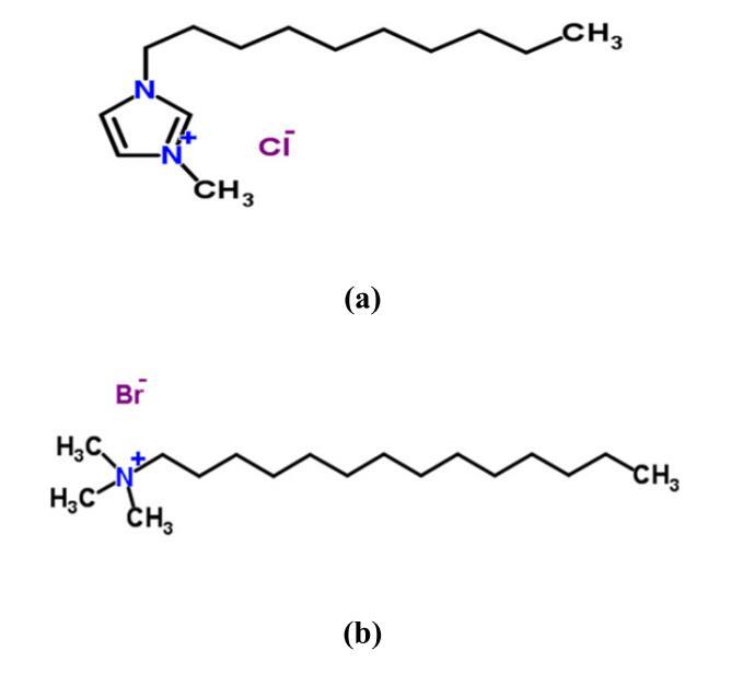 因此,牢記混合表面活性劑的上述優(yōu)點(diǎn),已嘗試研究陽離子表面活性劑與表面活性離子液體在純水中以及在二甘醇(DEG)-水二元混合物存在下的混合膠束化,為了進(jìn)一步了解二甘醇對(duì)這些混合體系的影響。所使用的離子液體為1-癸基-3-甲基咪唑氯化物[C10min][Cl],陽離子表面活性劑為十六烷基三胺(CET),陰離子染料為甲酚紅(CR)(方案1)。ILs在兩相均相催化過程中也有廣泛的應(yīng)用,在這些催化過程中,含有催化劑的一相與含有反應(yīng)物和產(chǎn)物的第二相完全不混溶。正如我們所知,二甘醇是一種有機(jī)溶劑,因此大多數(shù)催化反應(yīng)被認(rèn)為發(fā)生在離子液體和有機(jī)溶劑的界面[26]。