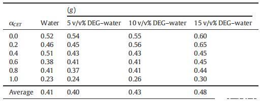 表5在純水中以及在T=298.15 K下存在不同體積百分比的DEG+水二元混合物時,純CET、[C10min][Cl]和混合物CET+[C10min][Cl]的有效疏水鏈長度(lc)、疏水鏈體積(v)、極性頭基團表面積(A)、填充參數(P)和半徑(R)的值。