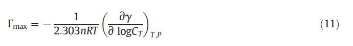 借助吉布斯吸附方程,我們可以使用公式(11)[62]計算表面活性劑在空氣-溶液界面的最大吸附量: