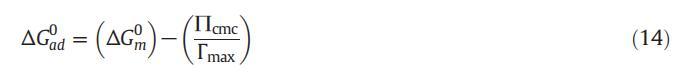 式(14)中的術語e∏cmcΓmaxT為我們提供了將單層表面壓力為零的兩親分子引入膠束所需的工作信息。ΔGm0和ΔGad 0的值均為負值,表明這兩個過程都是有利的,但是ΔGad 0的值比ΔGm0的值更為負,這表明所有這些系統的吸附過程比膠束形成過程更為有利。