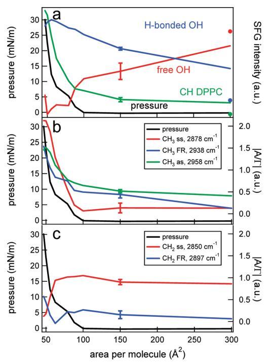 圖6。(a)DPPC的CH信號(綠色)、Hbonded OH信號(藍色)和游離OH信號(紅色)的表面壓力(黑色,左軸)和積分SFG強度(右軸)作為每個分子面積的函數。數據點是通過整合特定光譜區(qū)域獲得的,該區(qū)域由圖5的光譜中的彩色方塊標記。純水層的CH、OH和游離OH面積(在表面活性劑攤鋪前測量)分別表示為綠色、藍色和紅色圓點。為清晰起見,集成SFG信號已被標準化,并且彼此略微偏移。(b)表面壓力(黑色,左軸)和不同CH3共振(右軸)的絕對振幅/帶寬比(|A/Γ|),通過使用洛倫茲線型模型擬合圖5中的數據獲得。(c)和b一樣,但是對于CH2共振。典型誤差條如圖所示。