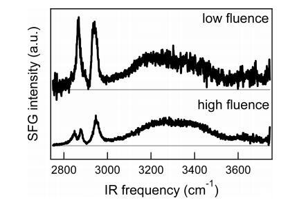圖7。高密度水上DPPC的SFG光譜(SSP極化)(~每分子45?2)在低濃度下(~1.5 mJ/cm2)和高通量(~10 mJ/cm2),單脈沖加熱量分別在0.3至3°C(取決于紅外頻率)和2至19°C之間。為了清晰起見,對光譜進行了偏移,并根據相對紅外強度進行了縮放。注意,由于在高通量下發(fā)生的熱效應,形狀非常不同。這兩種光譜都是用非旋轉槽測量的。