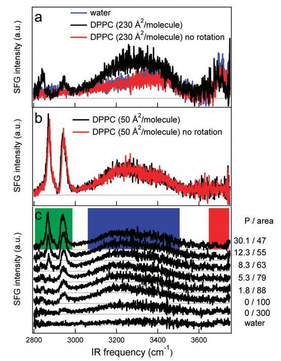 圖5。(a)DPPC在水上以230?2/分子(黑色)和不旋轉(紅色)槽的SSP極化的SFG光譜。樣品以這樣的方式旋轉:在激光焦點處,樣品以~0.06 m/s。不旋轉時,光譜與水相同?空中接口(藍色)。(b)在高密度(每個分子50?2)下,旋轉(黑色)和非旋轉(紅色)之間沒有區(qū)別。(c)裸露水面的SFG光譜(SSP極化)(底部光譜)和密度增加的水中DPPC的SFG光譜。壓力(mN/m)和每個分子的面積(?2)分別從底部到頂部增加和減少,在圖表旁邊給出。每個分子的面積由氯仿溶液滴的數量控制。彩色方塊標記了圖6中使用的積分區(qū)域。本實驗中使用了相對較低的紅外注量(1.5 mJ/cm2)。