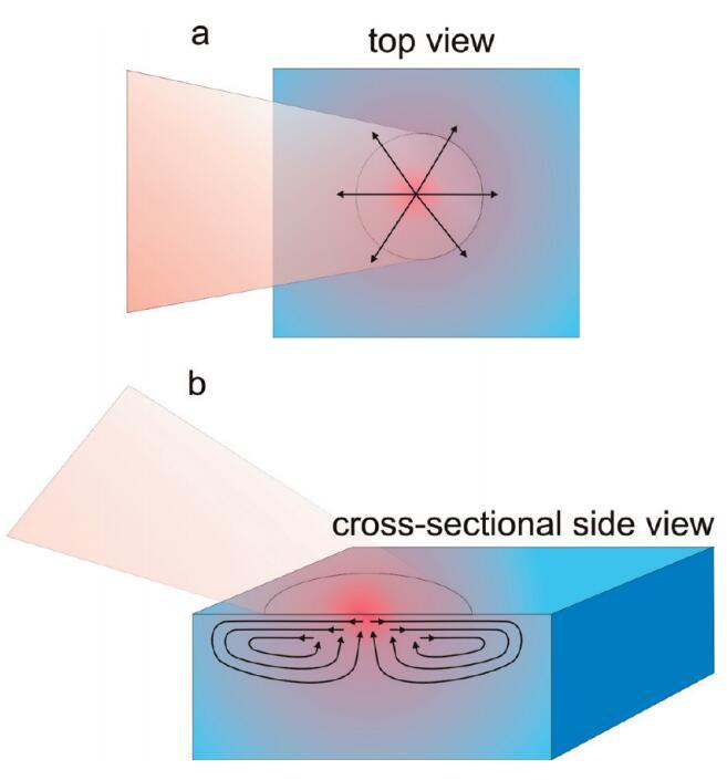 圖4。水樣近表面區(qū)域穩(wěn)態(tài)加熱引起的流動示意圖。溫度示意圖上用顏色表示,其中紅色表示熱,藍色表示冷。橙色陰影區(qū)域顯示入射到表面的激光束,箭頭表示溫度梯度誘導流動的方向。(a)俯視圖,顯示近表面區(qū)域的徑向位移,(b)橫截面?zhèn)纫晥D,顯示產生的Marangoni流動單元。請注意,在焦點的中心,水流向上,因此表面可以有效地持續(xù)更新。