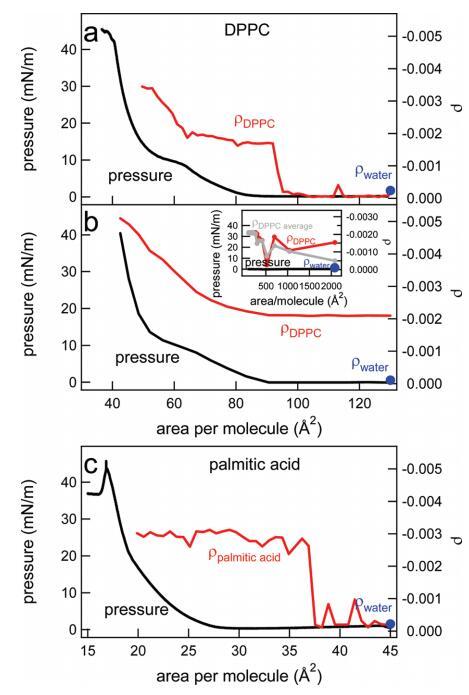 圖8。(a)在制備單分子層后,通過快速添加DPPC溶液持續(xù)壓縮單分子層,直到達到130?2的每分子面積,水上DPPC的表面壓力(黑色,左軸)和橢圓系數(紅色,右軸)。(b)水上DPPC的表面壓力(黑色,左軸)和橢圓系數(紅色,右軸)是每個分子面積的函數。通過逐滴添加更多DPPC,每次滴加間隔幾分鐘,改變了該區(qū)域。以這種方式達到的每個分子的最小面積為2000?2。插圖顯示了橢圓度系數(對于一個特定實驗(紅色)和三個實驗的平均值(灰色))以及非常低密度下的壓力。(c)在制備單分子層后,通過快速添加棕櫚酸溶液,直到達到每分子45?2的面積,連續(xù)壓縮單分子層期間,水上棕櫚酸的表面壓力(黑色,左軸)和橢圓系數(紅色,右軸)。在噴灑表面活性劑之前測量的純水橢圓度在每個面板中以藍色圓點表示。