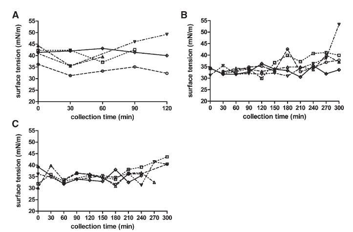 圖6。在禁食(A)、喂食(B)和高脂喂食(C)狀態(tài)下,表面張力(mN/m)隨餐后時(shí)間的變化。(--?--)主題1(··?··)主題2,(·–·)△·–·)主題3,(·-·▽·–·)主題4,(-◇–)科目5。