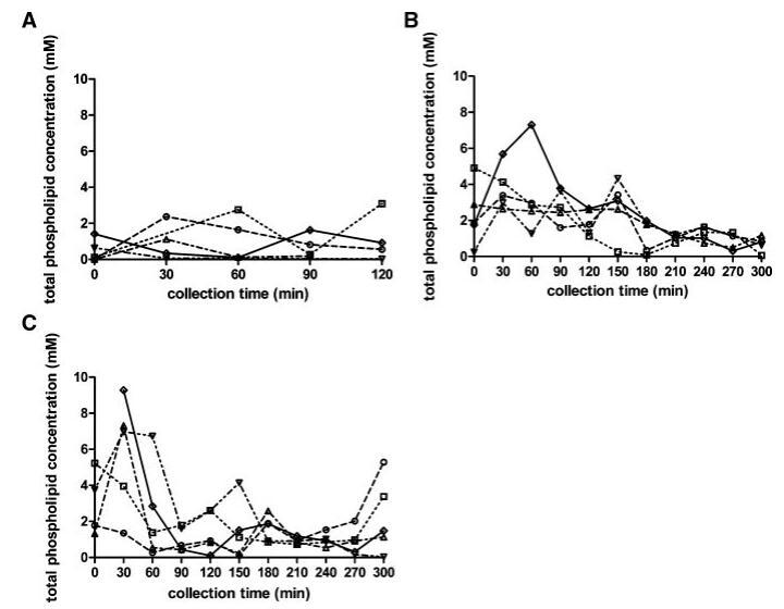 圖4。在禁食(A)、喂食(B)和高脂喂食(C)狀態(tài)下,總磷脂濃度(mM)隨餐后時(shí)間的變化而變化。(--?--)主題1(··?··)主題2,(·–·)△·–·)主題3,(·-·▽·–·)主題4,(-◇–)科目5。