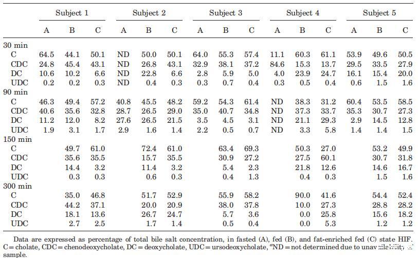 表3。餐后不同時(shí)間的個(gè)體相對(duì)膽汁鹽池成分(%)a