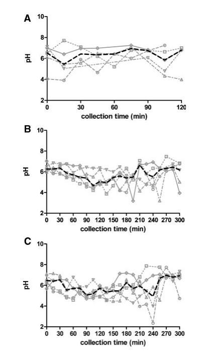 圖1。五名健康受試者在禁食(A)、喂食(B)和富含脂肪的喂食(C)狀態(tài)HIF中的個(gè)人和中值pH值隨時(shí)間的變化。(--?--)主題1(··?··)主題2,(·–·)△·–·)主題3,(·-·▽·–·)主題4,(-◇–)受試者5,(――中位)。