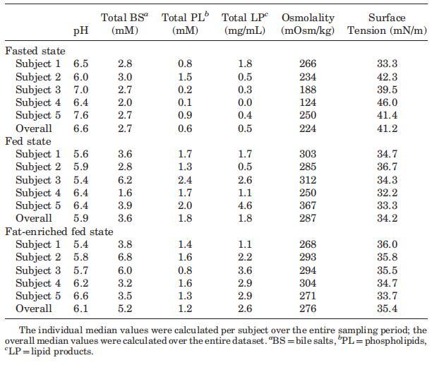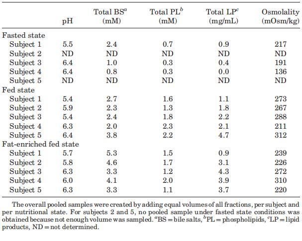 攝入Sure Plus1或Scandishake Mix1后前2小時(shí)的滲透壓通常高于禁食狀態(tài)下的HIF,盡管禁食狀態(tài)和兩種喂食狀態(tài)之間未達(dá)到顯著差異。禁食狀態(tài)滲透壓值一般為低滲透,或接近等滲透值。224 mOsm/kg的總體中值為低滲透性,與Brouwers等人1和Deferme等人報(bào)告的人類十二指腸吸出物的平均滲透壓一致。,38但高于Perez de la Cruz Moreno等人報(bào)告的平均值。24在給藥(n?3)后,在混合樣品中獲得的滲透壓較低,與Kalantzi等人11和Gisolfi等人報(bào)告的滲透壓較好。39在喂食和富含脂肪的喂食狀態(tài)下均發(fā)現(xiàn)高滲值,尤其是在消化的前3小時(shí)。在喂食和富含脂肪的喂食狀態(tài)下,總的中位數(shù)滲透壓為等滲透壓(分別為285和278 mOsm/kg)。進(jìn)食后180分鐘內(nèi)較高的滲透壓與膽汁鹽濃度、磷脂或脂質(zhì)產(chǎn)物總量無(wú)關(guān)。Kalantzi等人19將吸入十二指腸內(nèi)容物的高滲值歸因于雙糖和果糖復(fù)合碳水化合物的存在,以及后者的緩慢吸收。在本研究中未確定總碳水化合物水平,因此,該陳述無(wú)法驗(yàn)證。