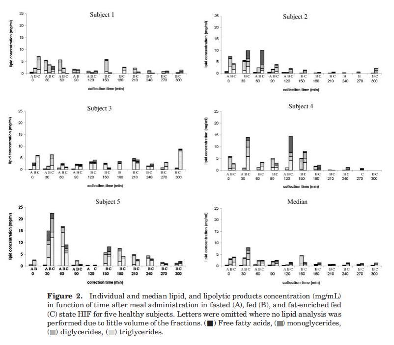 因此,根據(jù)這些數(shù)據(jù),TG和DG、MG或FFA之間沒(méi)有相關(guān)性。受試者的總脂質(zhì)濃度差異很大。與受試者4和5相比,受試者1、2和3在喂食條件下的十二指腸總脂濃度通常較低。Hernell等人也描述了從Treitz角度取樣的十二指腸脂質(zhì)含量的顯著受試者間差異。27除了明顯的受試者間差異外,個(gè)體濃度也隨時(shí)間波動(dòng)。受試者體內(nèi)的這種變異可能由多種因素解釋,包括胃排空的變化、胃腸道的擴(kuò)散、同時(shí)進(jìn)行的消化和吸收以及腸道內(nèi)容物的不均勻分布。利用磁共振成像(MRI),Weitschies及其同事最近證實(shí)了腸道內(nèi)液體的不均勻分布;28腸液被稱為在水囊中分離;此外,研究還表明,進(jìn)食后小腸液體總量顯著減少。胰脂肪酶在油水界面發(fā)揮作用;因此,脂肪分解消化產(chǎn)物預(yù)計(jì)將在這些水袋的直接環(huán)境中釋放。由于水分室不連續(xù)分布,脂肪分解產(chǎn)物在小腸中也不均勻分布。這可以解釋剖面中觀察到的可變性。然而,在五名受試者中,隨著時(shí)間的推移計(jì)算出的總脂質(zhì)濃度中值顯示,在給藥30分鐘后濃度降低,在給藥120分鐘后達(dá)到穩(wěn)定狀態(tài)(圖2)。由于個(gè)別pro文件有時(shí)與此中間配置文件存在很大差異,因此平均配置文件的有用性可能會(huì)受到質(zhì)疑。29,30然而,這一中位數(shù)曲線確實(shí)與先前的研究一致,在之前的研究中,攝入食物后約1小時(shí),脂質(zhì)濃度處于穩(wěn)定狀態(tài),持續(xù)3小時(shí)。11,12,31穩(wěn)態(tài)期間描述了恒定的TG濃度,而FFA濃度增加或恒定。在之前的每一項(xiàng)研究中,F(xiàn)FA水平在每個(gè)測(cè)量點(diǎn)都高于鎂水平;計(jì)算得出該比率約為3-6。相反,目前的數(shù)據(jù)集指出,在整個(gè)收集期內(nèi),鎂是主要成分,其次是FFA。TG的含量通常非常少或無(wú)法檢測(cè)到。這可能意味著膳食TG的快速水解,從胃脂肪酶開(kāi)始。其他人也提出了類似的意見(jiàn)。11,31當(dāng)將這些數(shù)據(jù)與以前提出的腸道脂質(zhì)濃度進(jìn)行比較時(shí),應(yīng)注意到以前的濃度始終以摩爾水平表示,而在本研究中,結(jié)果以w/v濃度單位表示。因此,MG/FFA的比率在以重量為基礎(chǔ)表示時(shí)將以犧牲游離脂肪酸為代價(jià)進(jìn)行移動(dòng),當(dāng)然對(duì)于由長(zhǎng)鏈脂肪酸組成的脂質(zhì)材料而言。
