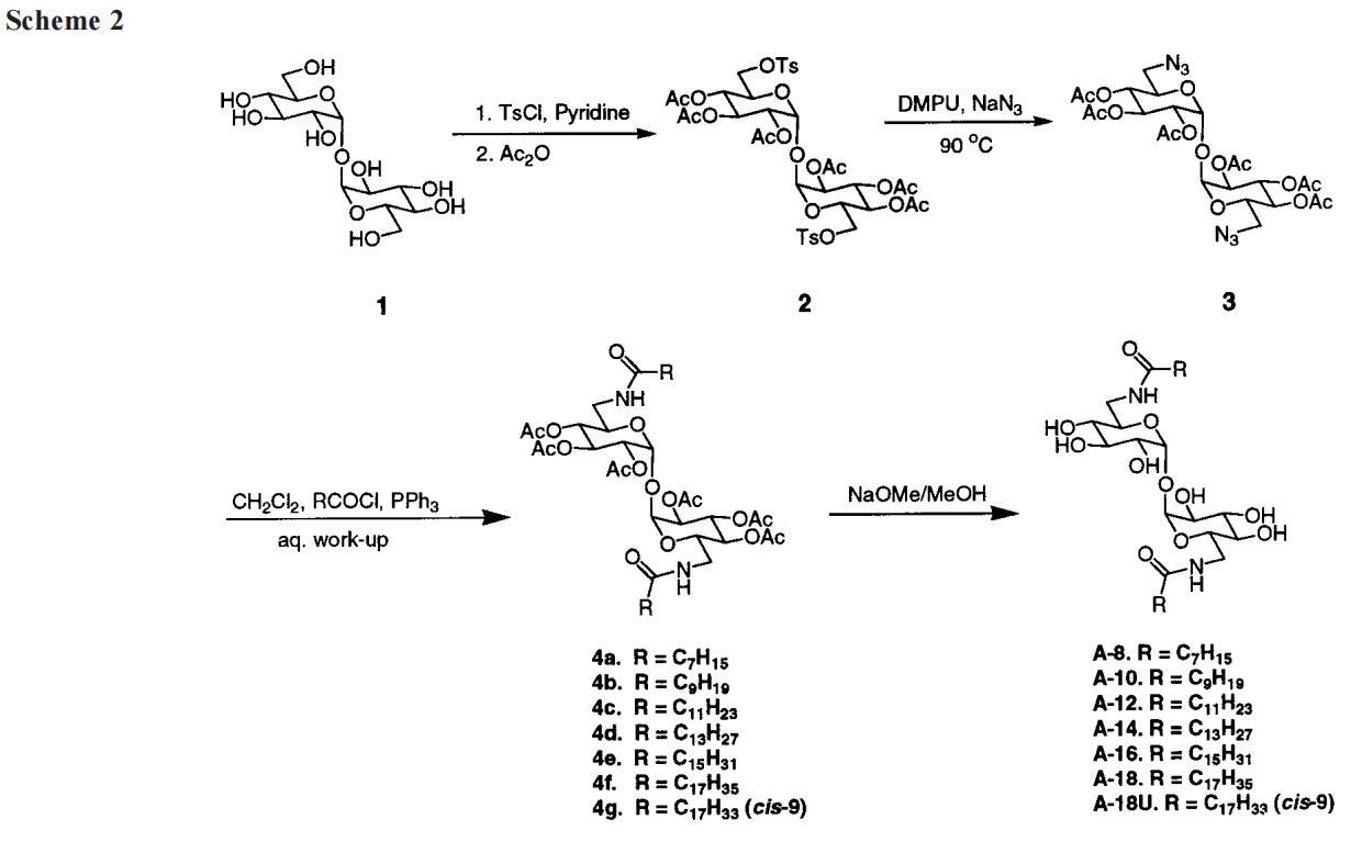 2,3,4,2′,3′,4′-六鄰乙?;?6,6′-二脫氧卡那酰胺-6,6′-二脫氧,r-D-海藻糖,4c。將3(2.0 g,3.2 mmol,6.4 mmol當量)、50 mL CH2Cl2、2.2 mL(9.8 mmol)月桂酰氯和2.20 g(8.4 mmol)PPh3與10 mL CH2Cl2反應。橙黃糖漿的硅膠層析,然后從己烷中進行重結晶(以去除1H NMR檢測到的PPh3鹽雜質),得到1.08 g(36%)純4c,mp 64-68°C。