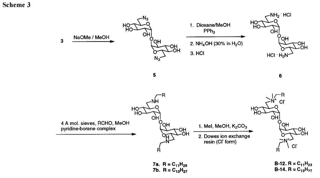 方案2和方案3以及實驗部分詳述了我們獲得A系列和B系列海藻糖雙子的方法。另外幾條評論有助于美化這一信息。B型海藻糖雙子最明顯的先驗途徑是用長鏈叔胺直接取代2的甲苯磺?;鶊F。盡管沿著這些路線進行了多次嘗試,但只獲得了分解產物或起始材料。然而,如方案2所示,我們成功地用疊氮化合物取代了2的兩個甲苯磺?;铮玫搅?。此處采用文獻程序28,但出于安全考慮,HMPA被DMPU取代作為溶劑。然后,雙疊氮化物3經過Staudinger反應25,29,在一個步驟中得到長鏈雙酰胺4a-g,而該長鏈雙酰胺4a-g只需脫保護即可獲得a系列雙子。在方案3中,脫保護糖5的疊氮化物還原將化合物轉化為二伯胺鹽酸鹽6。長鏈醛與6和吡啶硼烷絡合物30的還原胺化得到海藻糖衍生物7。使用NaBH3-CN作為還原劑,該反應的產率很低。在用甲基碘化物將7甲基化,然后進行離子交換(以促進純化和提高溶解性)之后,我們得到了B系列海藻糖雙子。