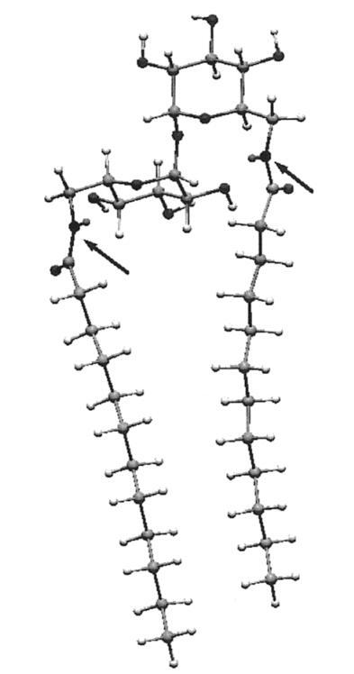 計算首先將海藻糖插入宏模型程序42,并對結構進行琥珀色能量最小化。從使用琥珀色*力場的25000個構象搜索中,我們選擇了能量最低的構象,該構象恰好與報告的X射線結構重疊。43,44接下來,該結構中的6-和6′-羥基被乙酰氨基取代。在模擬的水環境中,用AMBER*再次進行了25000次構象搜索。然后乙?;皇榛〈?,然后對生成的a-12雙子座進行了另一次搜索。結果表明,整個構象由酰胺羰基和相鄰葡萄糖環的2-羥基之間的兩個分子內氫鍵控制。氫鍵導致兩條全反式鏈彼此擺動約95°。A-12的固態紅外光譜證實了這種相互作用,該光譜顯示1646 cm-1處有羰基帶,而Hecameg的羰基帶為1700 cm-1,單體葡萄糖類似物的羰基帶為1698 cm-1。25由于這種構象會不切實際地排除分子內疏水締合,而且在任何情況下,羰基氫鍵位點的溶劑可能會淹沒在水中,我們故意不允許-CdO氫鍵,并重新計算。通過這種方式,我們得到了圖6??梢钥吹?,一條鏈上大約有八個碳與其伙伴鏈的碳并排排列。N/N距離僅為7.4?,整體分子形狀為“管狀”。用另一種方式說,糖的頭基延伸的距離不比兩條鏈的寬度大多少,就像人們預期的一種易于堆積成雙層的化合物那樣。45因此,正如前面從實驗數據得出的結論,海藻糖更像是一個統一的頭基,而不是一個可以有效隔離鏈的長間隔基。