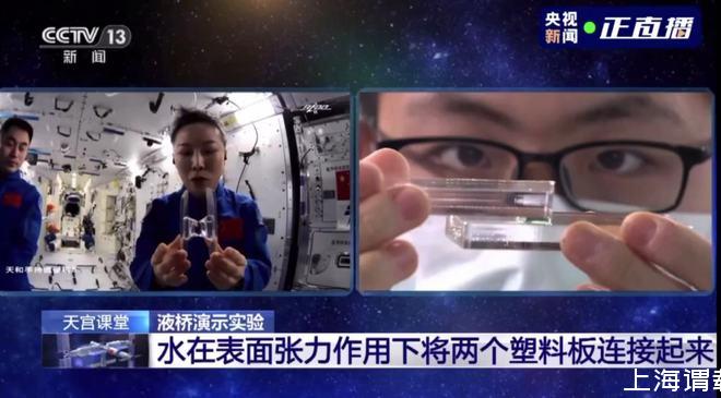 王亞平解釋,在地面重力的環(huán)境下,水的表面張力微不足道,所以同學們無法用純水做出一個液橋。而在太空中,由于重力消失,液體表面張力就可以用液體搭建出一座橋。