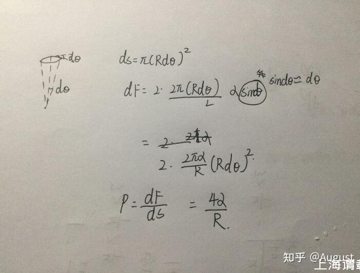 (在這里因為一個肥皂泡膜與兩個介值相接觸,所以膜的兩側各形成一個表面張力,由于肥皂泡厚度很小,所以這兩個表面張力近似相等)