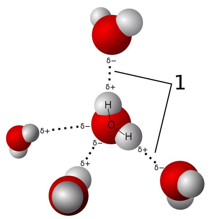 水由氫和氧原子組成。當氫(H)原子與氧(O)、氮(N)或氟(F)結合時,氫唯一的一個電子會與它們形成共價鍵,這時候氫原子的電子由于被O、N或F吸引而稍稍“跑偏”,導致氫原子這一端呈現更多的正電性(氫原子核帶正電);與之相對應地,分子的另一端會因為吸引電子的能力更強而顯示出負電。分子對外顯示出比較強的電極性,分子與分子之間會因為電極性的不同而相互吸引。