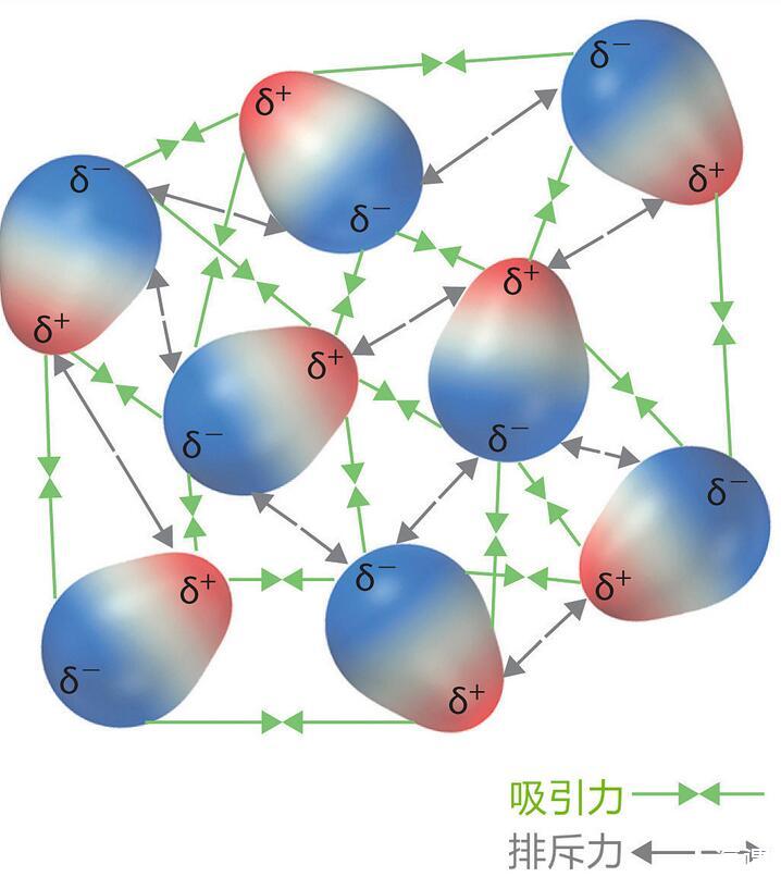 液體分子之間通常存在兩種相互作用力:范德華力和氫鍵,這兩種力使分子之間相互吸引又保持一定的距離,它們是由分子的化學電性質決定的。