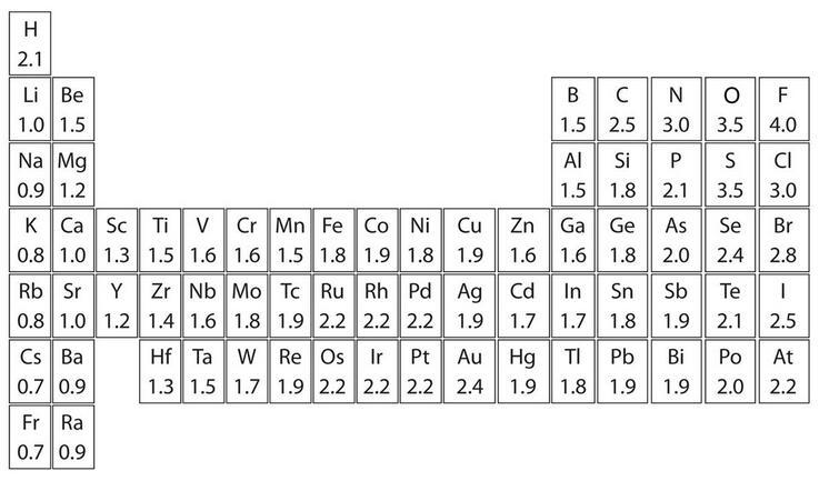 上圖是元素周期表中部分元素電負性的標量,電負性是一個無單位數,數字越高,原子吸引電子的能力越強。我們可以通過確定參與共價鍵的兩個原子的電負性的差異來判斷共價鍵的極性: