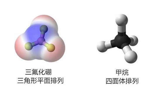 前節介紹了氯氣分子和二氧化碳分子,它們都是非極性的。對于由更多原子組成的一些分子,由于組合幾何結構的關系,它們也往往對外顯示出極性或非極性。比如三角形平面排列的三氟化硼和四面體排列的甲烷,它們都是非極性分子,因此不會產生整體偶極子。
