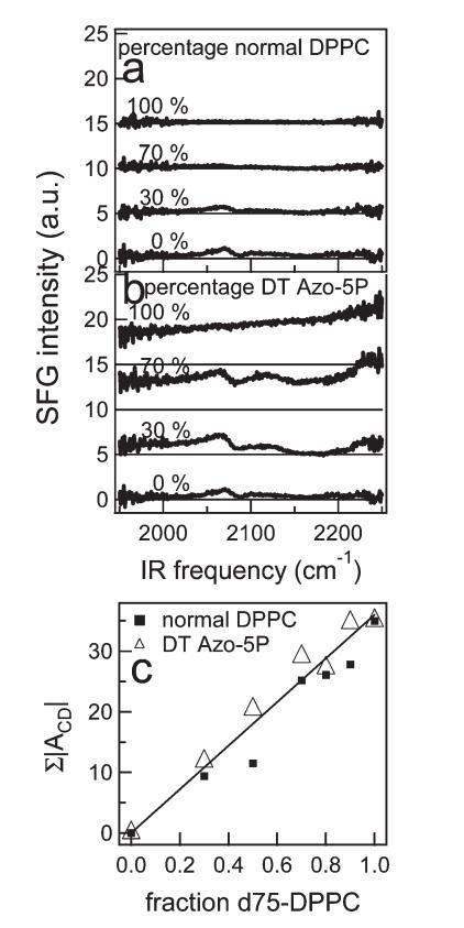 圖9:。(a)正常DPPC和d75 DPPC不同混合物的CD區VSFG光譜。圖中給出了混合物中正常DPPC的百分比。為清晰起見,光譜偏移,細線表示零。(b)與a部分類似,但適用于DT Azo-5P與d75 DPPC的混合物。(c)通過擬合VSFG光譜獲得的CD振動振幅之和,如文中所述,作為含正常DPPC或DT Azo-5P的二元混合物中分數d75 DPPC的函數。在本實驗中,為了獲得混合物的高質量數據,紅外注量很高,導致通過VSFG光譜中相對較高的CH2和CD2振幅觀察到的脂質尾部出現小的無序。