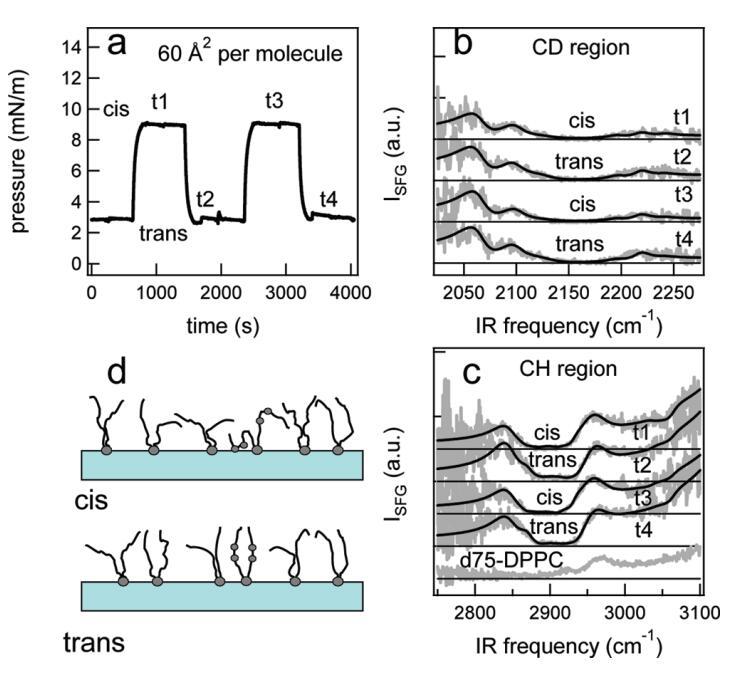 圖6:結果:DT Azo-5P/d75 DPPC的1:5混合物在脂質/水界面上的面積為60?2/分子。(a)表面壓力與時間的關系。370和450 nm光照射~100秒分別產生cis(高壓)和trans(低壓)狀態。壓力的微小劇烈波動是由于樣品高度的變化,以校正水的蒸發。(b)相應的VSFG光譜(灰色)以及CD區域的擬合。為了清晰起見,對光譜進行了偏移。(c)VSFG光譜(灰色)與fits一起引導眼睛進入CH區域。底部曲線顯示了P下純d75 DPPC的光譜~40 mN/m.(d)脂尾方向示意圖。光開關脂質的偶氮苯部分用灰色圓圈表示。