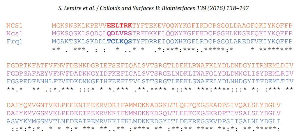 圖1.人類NCS1(橙色)、裂變酵母NCS1(粉紅色)和芽殖酵母Frq1(藍色)的序列比對。在鈣存在和不存在的情況下,負責肉豆蔻基擠出的基序用紅色表示[29](為了解釋本圖例中對顏色的引用,讀者請參閱本文的網(wǎng)絡版本)。