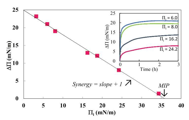 確定綁定參數(shù)的典型示例如圖2所示。實際上,對于6.0、8.0、16.2和24.2 mN/m的i,分別獲得了21.0、19.0、12.9和8.0 mN/m的(圖2插圖)。被繪制為i的函數(shù),導致負斜率。因此,在DPPE存在的情況下,mNCS1的MIP值為35.8±1.1 mN/m,協(xié)同值為0.30±0.02。這種積極的協(xié)同作用表明mNCS1和這種脂質(zhì)單層之間發(fā)生了積極的相互作用。然后,以不同的i注射每種脂質(zhì)和MIP,并根據(jù)表面壓力動力學計算協(xié)同值。