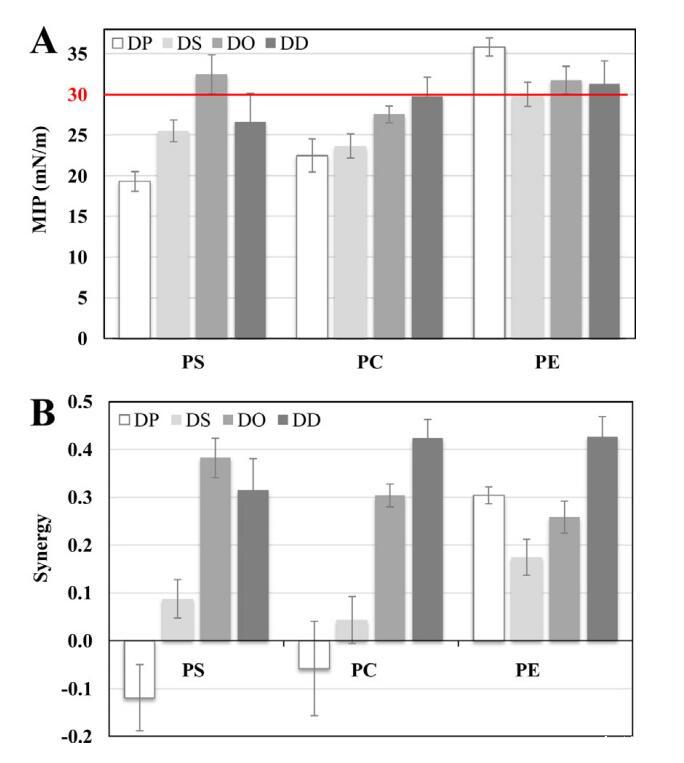 圖3.在鈣存在下,使用DPP、DSP、DOPS、DDPS、DPPC、DSPC、DOPC、DDC、DDPC、DPPE、DSPE、DOPE、DOPE和DDPE單層的mNCS1的MIP(A)和協(xié)同(B)值。MIP和synergy值的不確定性如第2.3節(jié)所述計算。