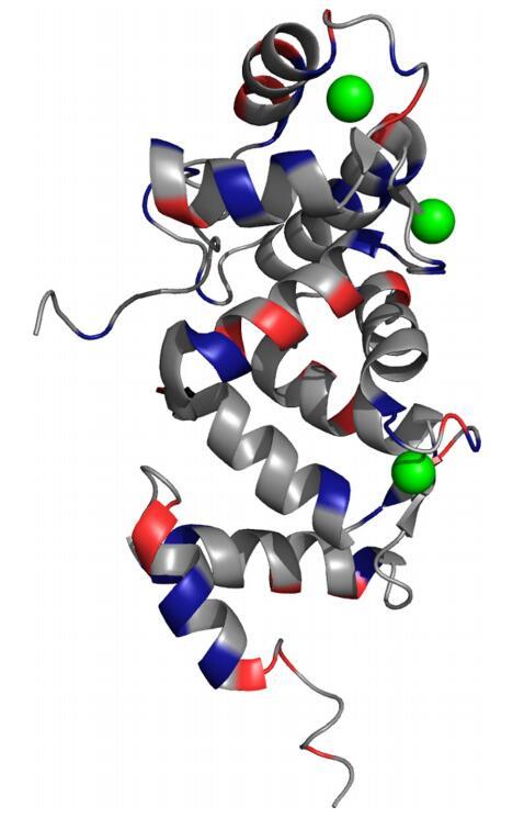 圖4.nmNCS1結(jié)構(gòu)上的正(紅色)和負(藍色)電荷(PDB 2LCP)[23](關(guān)于此圖例中顏色的說明,讀者請參閱本文的web版本)。