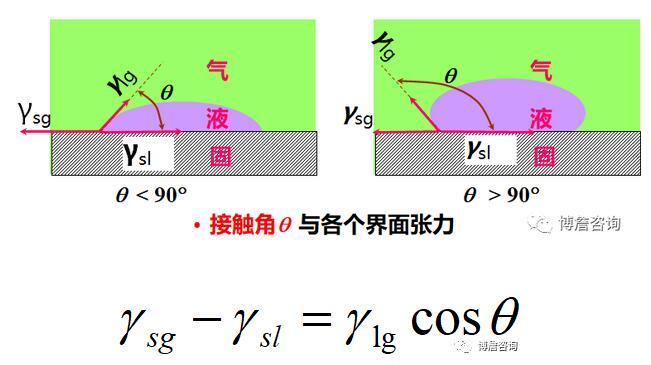 由楊氏方程,θ由γsg,γsl,γlg決定。對于指定的固體,液體表面張力越小,其在該固體上的θ也越小。對于同一液體,固體表面能越大,θ越小。