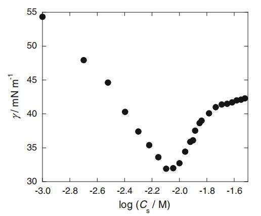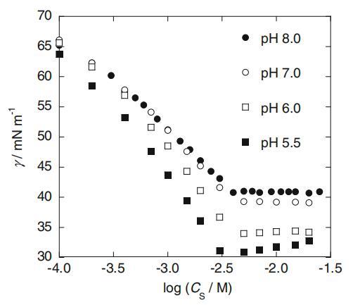 在圖1中,僅含SLAS且不含任何緩沖液的水溶液的界面張力(γ)與總SLAS摩爾濃度(CS)的對數作圖。如圖所示,盡管SLAS仔細重結晶,但γ值出現了異常的最小值。然后,樣品溶液的pH值在浸漬底部約為5.5,并隨CS增加至約8。由于此浸漬應是由取決于SLAS濃度的pH變化引起的,因此所有實驗均在磷酸鹽和硼酸鹽緩沖液控制的恒定pH下進行。則圖1中觀察到的下降在每個值的受控pH下完全消失(見圖2)。cmc后,pH 5.5下的γ值略有增加,因為樣品溶液的pH因其緩沖容量的限制而緩慢增加。在1.0mM(膠束前濃度)和25mM(膠團后濃度)的恒定CS下,γ值相對于pH值繪制在圖3中,其中還繪制了十二烷基硫酸鈉(SDS)的結果作為對比示例。與SDS相比,非常有趣的是,當pH值低于約7時,SLAS的γ值顯著降低。接下來,圖4中繪制了cmc和C20(其γ值比純水的γ值降低20 mN/m時的表面活性劑濃度)與pH的關系圖。這兩個值在較低pH值區域也降低,盡管SDS的pH值不隨pH值而變化(數據未顯示)。此外,如該圖中cmc/C20比率的曲線圖所示,這些比率在pH值小于7.3的區域內增加。該比率的增加通常意味著親水性頭基的尺寸增加和/或表面活性劑的反離子與頭基的結合更緊密[11]。