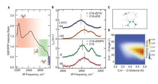 十六烷液滴在D2O中的SFS光譜中~100 cm?1的相當(dāng)大的頻率偏移(由灰色峰形突出)表明,電荷必須從水的O–D基團(tuán)轉(zhuǎn)移到油相的十六烷C-H基團(tuán)上,因?yàn)樗鼈兪墙邮茈娮用芏鹊奈ㄒ缓蜻x基團(tuán)。如果存在如此強(qiáng)的相互作用,即可以預(yù)期油分子的振動模將經(jīng)歷向與高頻O-D模相反的方向移動。這種遷移應(yīng)伴隨著結(jié)構(gòu)的變化,如C–H???O H鍵的存在。為了研究這一點(diǎn),記錄了界面C-H模的SFS譜,并進(jìn)行了MD模擬。界面C-H模的SFS譜圖顯示了CH 2(CH 2-ss)和CH 3(CH 3-ss)的對稱拉伸模在~2850和~2878 cm?1附近。十二烷-水界面顯示水和油分子相互作用讓人聯(lián)想到水和油之間的H鍵。作為C-H鍵的弱H鍵的受體,水分子上的O孤對提供了一些電子密度,使十二烷分子帶一個負(fù)電荷。