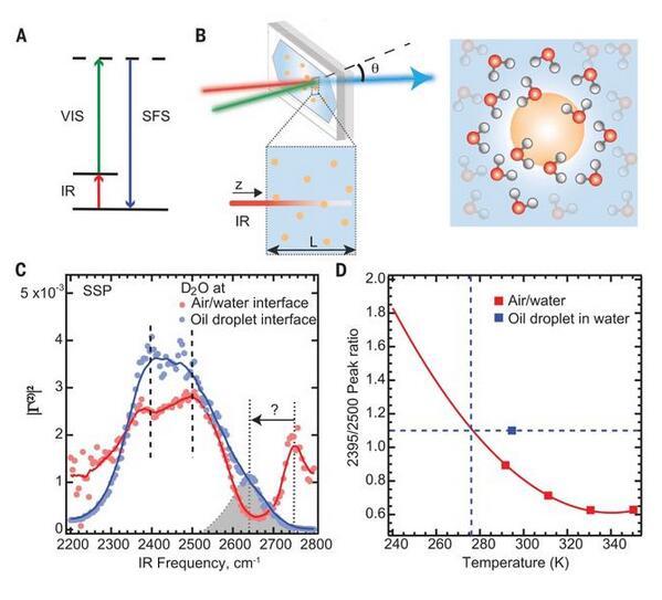 氫的疏水性代表了一種基本的物理性質(zhì),它決定了水介質(zhì)中的各種過程,如蛋白質(zhì)折疊、自組裝和聚集。亞微米級疏水油滴或水微粒是了解疏水作用機(jī)理的重要模型系統(tǒng)。然而,這些界面的電荷和結(jié)構(gòu)都有很大的爭議。雖然電荷轉(zhuǎn)移模型表明水是油滴電荷存在的關(guān)鍵,但油滴旁邊的水的結(jié)構(gòu)同樣存在爭議。因此,疏水液體材料旁邊的水的結(jié)構(gòu)仍然是未知的。