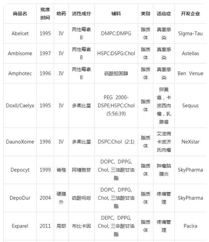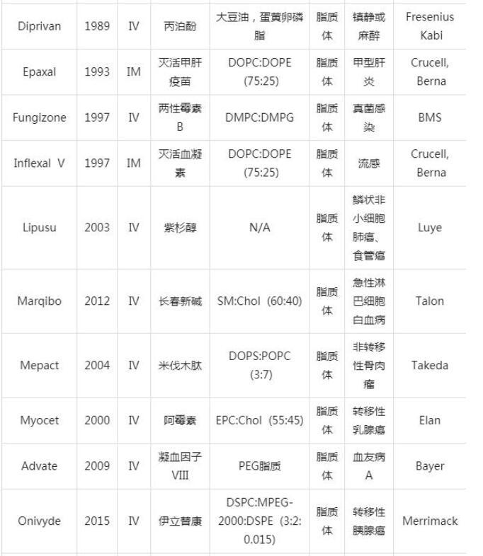 由于EPR效應,脂質納米粒在腫瘤中的蓄積使得納米顆粒在腫瘤細胞附近選擇性地釋放抗腫瘤藥物。Doxil是最早獲批的抗腫瘤納米制劑,也是最早獲批的脂質體藥物。該產品可以改善蒽環(huán)類藥物阿霉素的藥代動力學和生物分布,阿霉素是一種強效抗癌劑,但具有心臟毒性。Doxil利用EPR,使用空間穩(wěn)定的納米顆粒(~100 nm)來延長藥物在血漿中的循環(huán)時間,同時降低多柔比星的心臟毒性。Doxil作為靜脈注射劑開發(fā),由大豆磷脂酰膽堿、膽固醇和DSPE-PEG2000組成,用于治療晚期卵巢癌、多發(fā)性骨髓瘤和HIV相關的卡波西肉瘤。