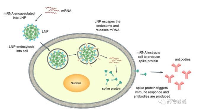 脂質納米粒最新的成功案例是作為遞送載體用Pfizer/BioNTech和Moderna獲FDA批準的兩種COVID-19信使RNA(mRNA)新冠疫苗,這兩款疫苗以無與倫比的速度開發(fā)上市,并在流行病毒預防方面有著顯著的效果。疫苗將編碼SARS-CoV-2刺突蛋白的mRNA遞送到宿主細胞的細胞質中,被翻譯成刺突蛋白充當抗原,對病毒產生免疫反應。