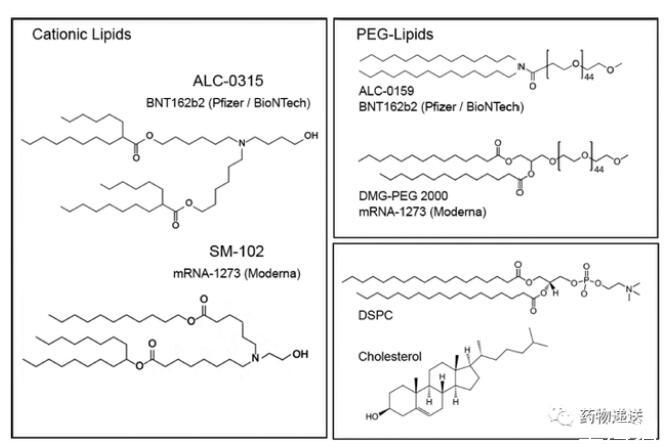 兩款mRNA疫苗采用的脂質納米粒組成非常相似。都含有可電離的脂質,該脂質在低pH值時帶正電利于與mRNA靜電作用絡合,在生理pH值時呈中性促進mRNA的遞送和釋放并減少潛在的毒性。都含有聚乙二醇化脂質,以減少血清蛋白的抗體結合和吞噬細胞的清除,從而延長全身循環(huán)時間。磷脂二硬脂酰磷脂酰膽堿(DSPC)和膽固醇形成穩(wěn)定結構有助于包載mRNA。兩款疫苗的可電離陽離子脂質:PEG-脂質:膽固醇:DSPC的摩爾比分別為46.3:1.6:42.7:9.4(Pfizer/BioNTech)和50:1.5:38.5:10(Moderna)。脂質納米粒的粒徑為80~100nm,每個脂質納米粒中包含有約100個mRNA分子。