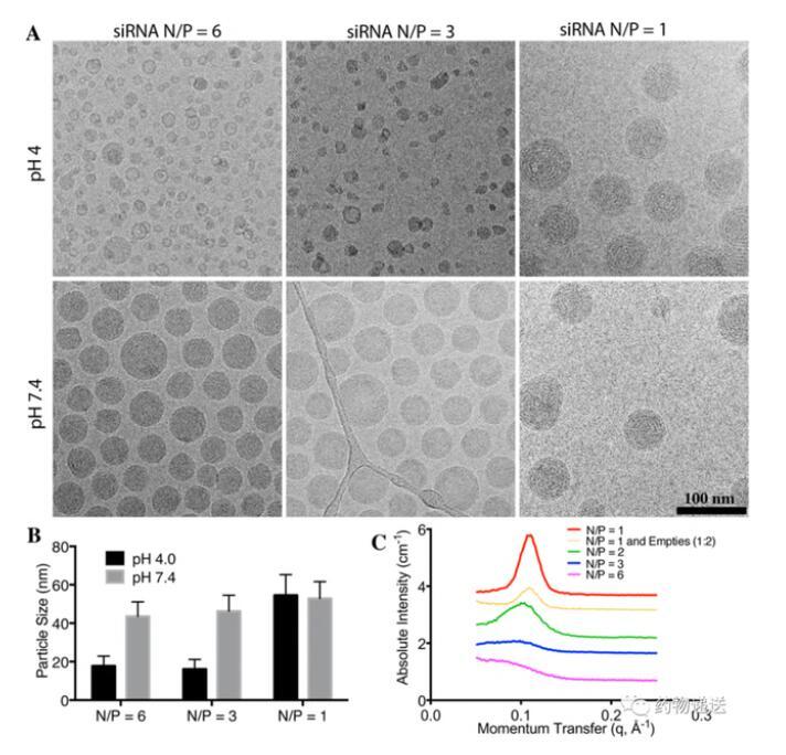 使用帶電荷脂質制備siRNA-LNP時,正電荷與負電荷的數量比會影響納米粒的大小、穩定性、電位等性能。在siRNA-LNP中,正電荷通常為具有可電離銨根(N)的陽離子脂質,而負電荷則為帶有大量磷酸根(P)的核酸分子,兩者可通過靜電吸附的方式結合在一起。因此,不合理的比例可能會導致粒徑過大、穩定性差等缺陷。值得一提的是,在研究中發現,當N/P=1時,pH中和后LNP的粒徑不會有較大改變;當N/P=3或者6時,LNP在pH=7.4的緩沖液中粒徑會變大。而永久陽離子脂質(例如DOTAP)制備的LNP在任何pH緩沖液中都不具有固體核心結構。