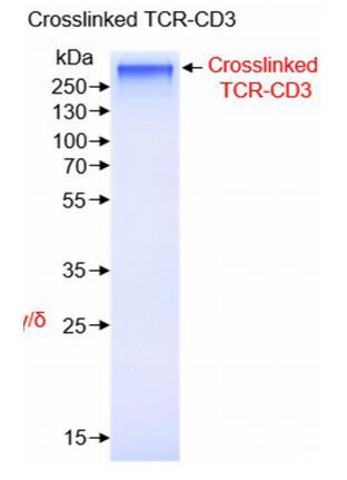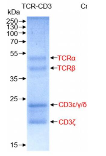 膜蛋白復(fù)合體TCR-CD3交聯(lián)后進(jìn)行凝膠過(guò)濾分子篩層析,進(jìn)行SDS-PAGE實(shí)驗(yàn),發(fā)現(xiàn)得到比較純的復(fù)合體。