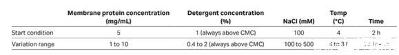 當(dāng)篩選去垢劑時(shí),要注意每個(gè)去垢劑的臨界膠束濃度(CMC)。CMC是指自由的去垢劑分子形成膠束結(jié)構(gòu)需要的濃度。因?yàn)槿芤合喈?dāng)于膜蛋白從細(xì)胞膜上去除進(jìn)入去垢劑膠束,所以CMC是蛋白提取所需的最低濃度。CMC值可參考表二。